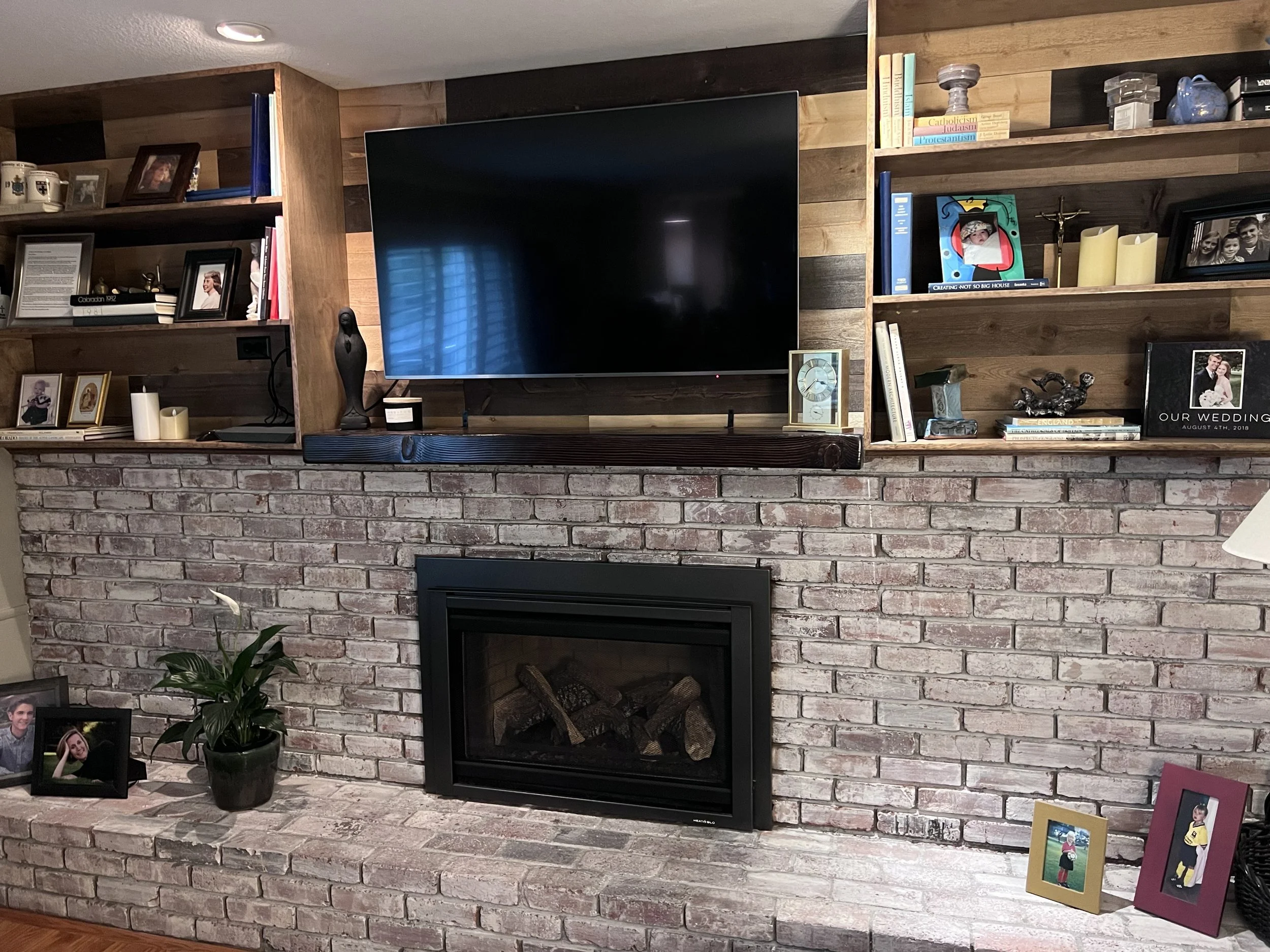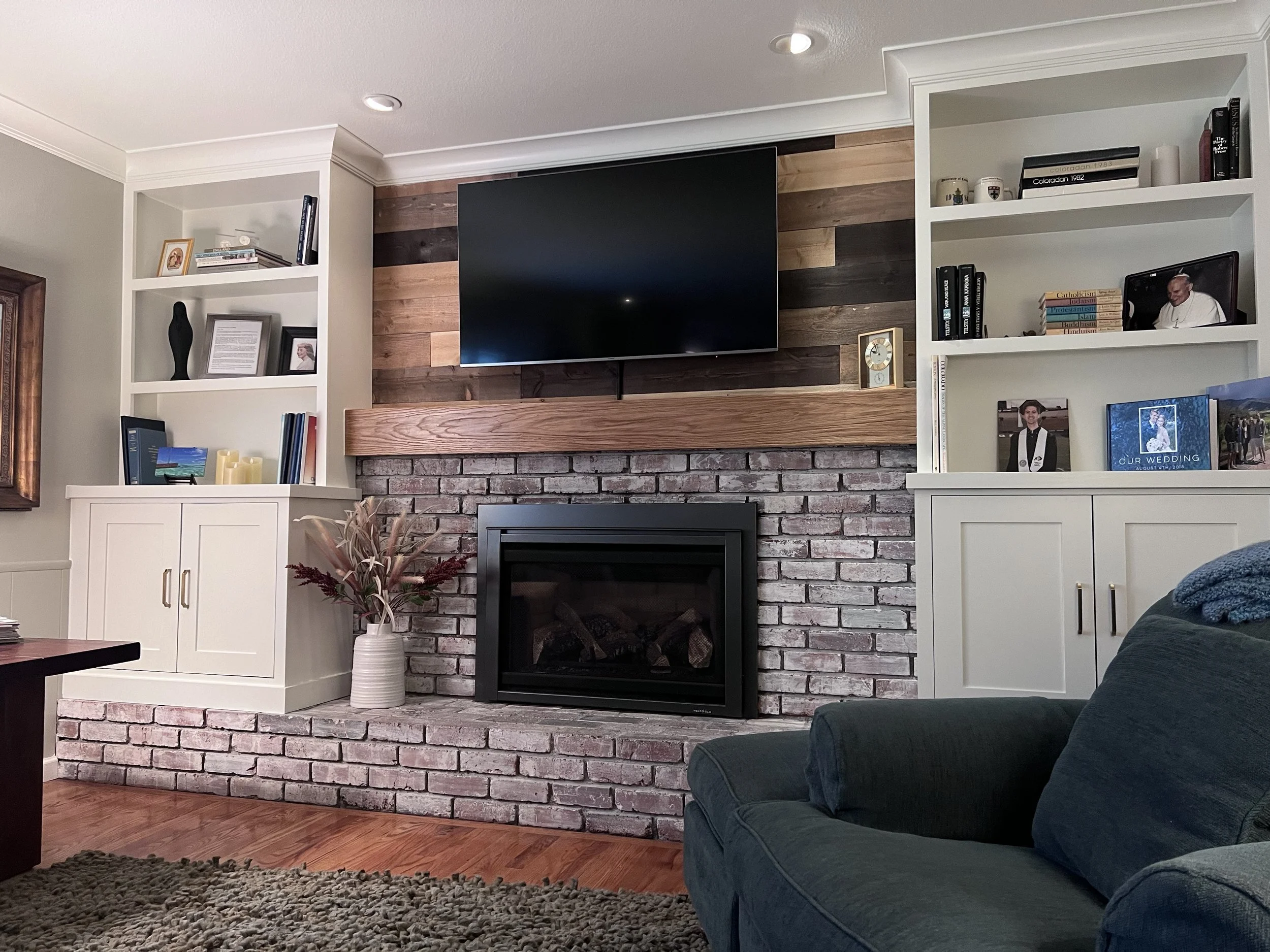 For this fireplace remodel, we took the existing idea that was done by a previous contractor and transformed it into what the customer actually wanted. Custom, site-made cabinets with inset doors, upper shelving built over the brick mantel, and a custom hand-textured white oak mantel. Adjustable shelving inside the cabinet, and crown molding that ties in seamlessly to the existing crown we previously installed.