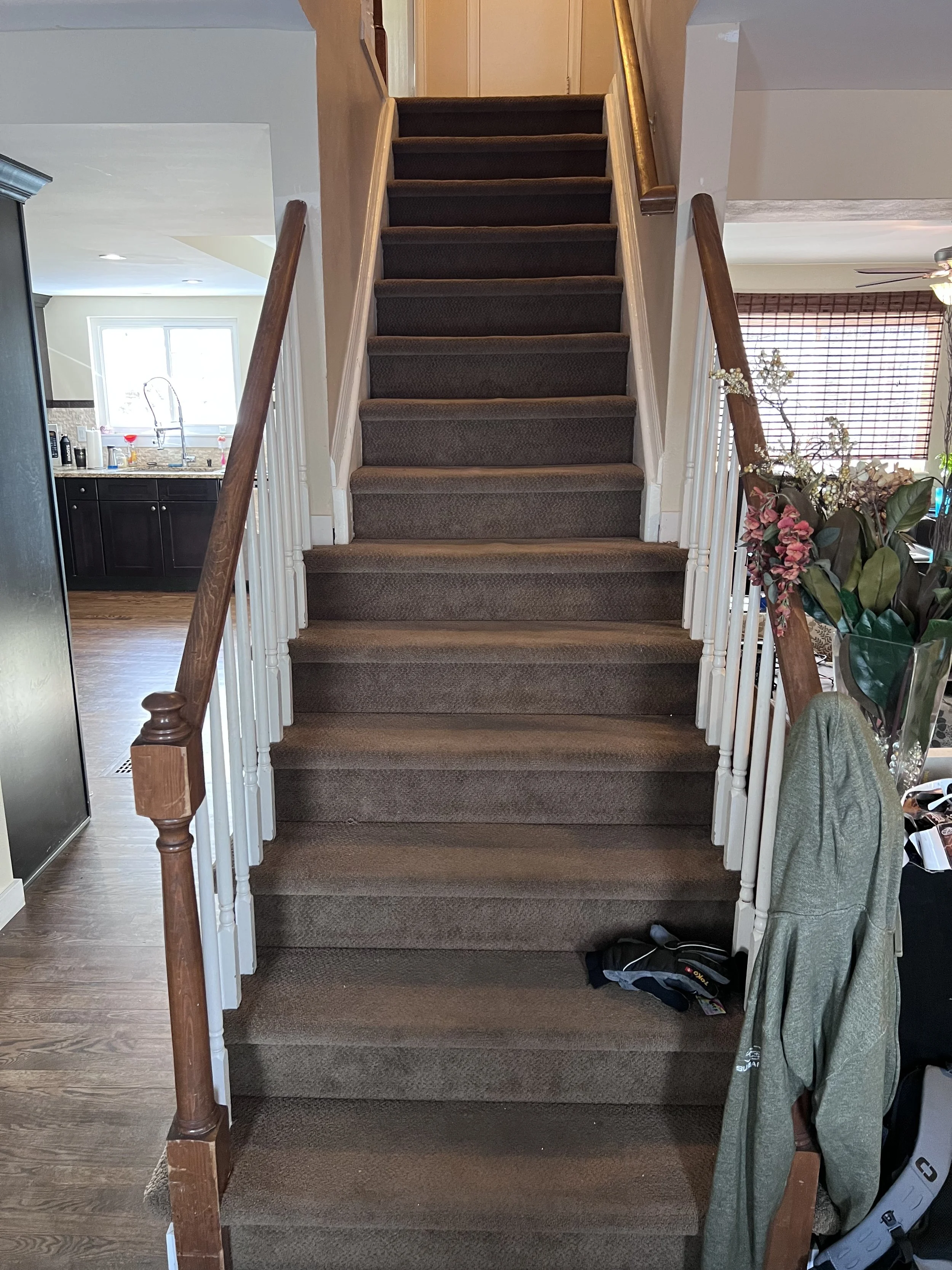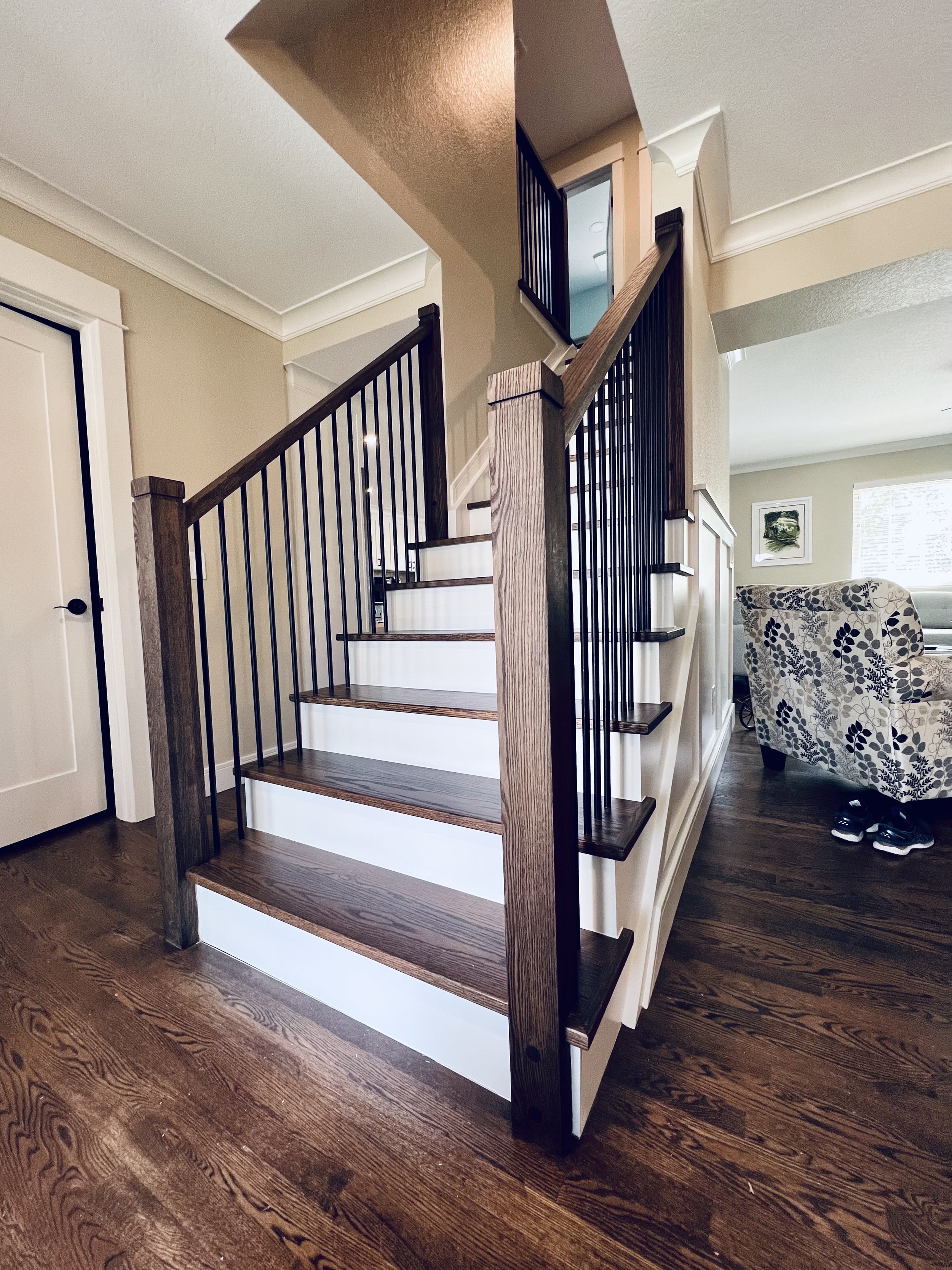 For this staircase remodel, we first custom wrapped the stringers to properly cover the pine stringers to provide a clean appearance, and constructed the handrail with red oak newels, handrail, rod iron balusters (without feet) and custom wrapped the risers. The difference is night and day! This project also included the entire house of doors, casing, baseboard, wainscoting, crown molding, mantel, and custom built-ins.
